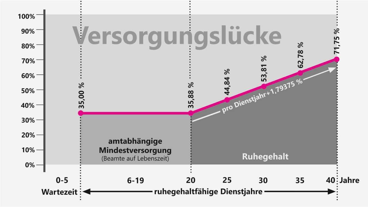 Die Beamtenlaufbahn ist in mehrere Abschnitte aufgeteilt: Sobald man zum „Beamten auf Lebenszeit“ ernannt wird, ist man sozusagen unkündbar. Wenn ein Beamter jedoch dienstunfähig aufgrund von Krankheiten oder Freitzeitunfällen erklärt wird, besteht erst mit dem Status „auf Lebenszeit“ Anspruch auf Ruhegeld. Und das alles auch nur, wenn 5 Jahre Wartezeit erfüllt wurden. Zudem ist das Ruhegeld in den ersten Jahren sehr gering.